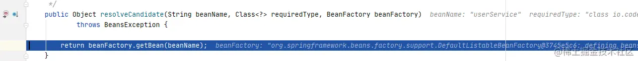 跟进descriptor.resolveCandidate(autowiredBeanName, type, this)方法查看,真是资本家看了都落泪,这里又开始了一个getBean()操作。这里又会进行一套操作,详细可见之前的文章Spring Ioc源码分析系列--Bean实例化过程(一),这里不再赘述。