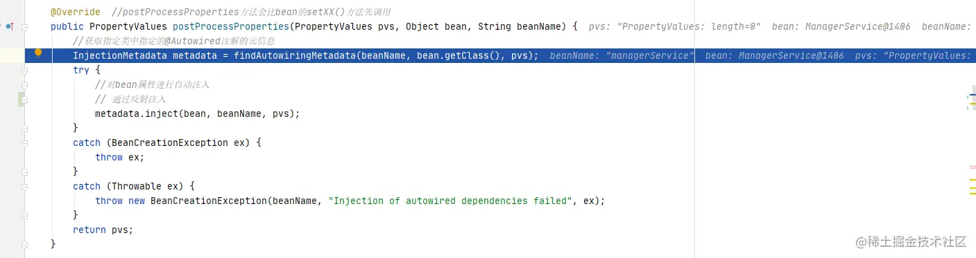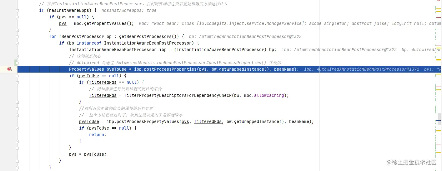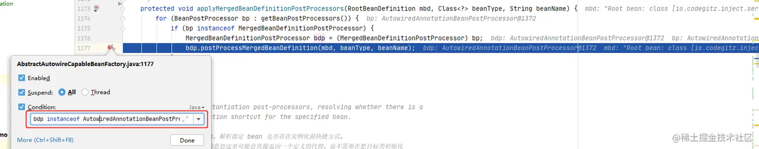 跟进方法,这里也一样,加上条件bdp instanceof AutowiredAnnotationBeanPostProcessor,聚焦目标一步到位。