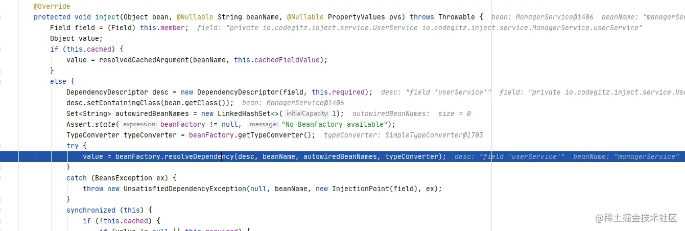 解析依赖这里有非常多的细节需要处理,我这里就不罗里吧嗦全部说清楚,感觉也说不清楚,这里就抓住一个脉络,注入的是一个简单对象的依赖,其他的细节不进行过分深究,有兴趣可以自行研究一下。
