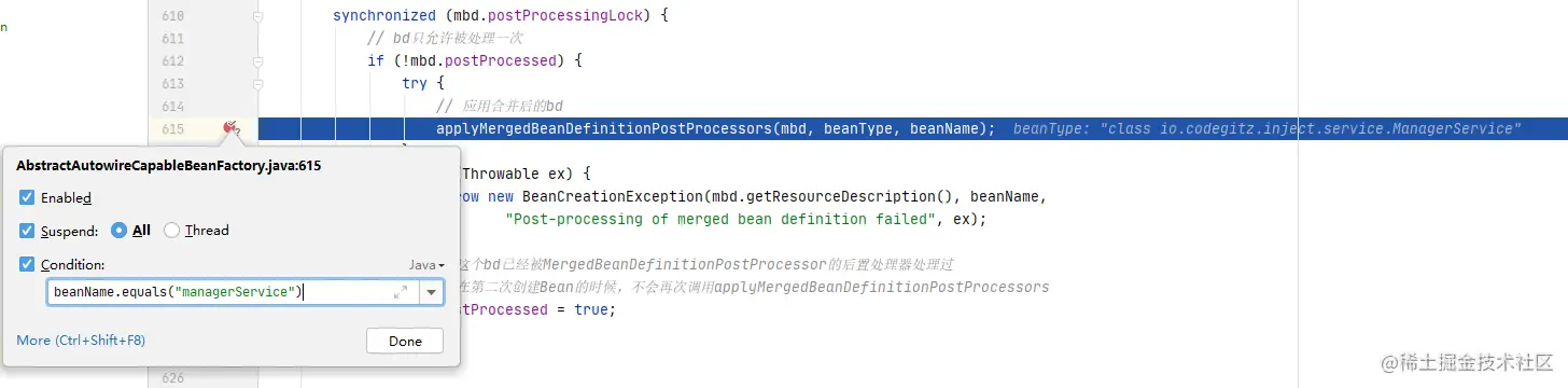 我们先看预处理,直接定位到这里的实现代码位置,在AbstractAutowireCapableBeanFactory#applyMergedBeanDefinitionPostProcessors()方法里。调试的时候加上条件,这样一步到位节省很多时间。