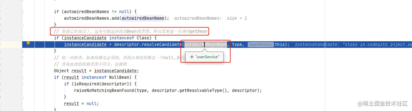 跟进findAutowireCandidates()方法代码,注意这个方法返回的只是候选依赖的bean名称和class类型,找到名称后还需要进行获取bean对象的操作。