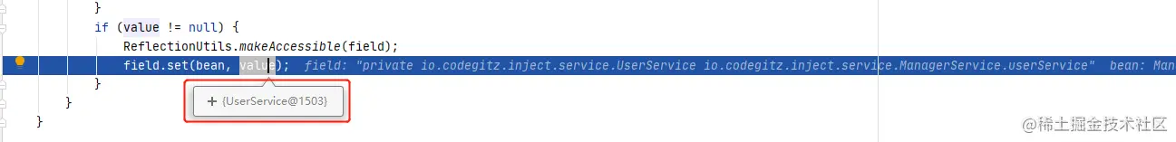 回到AutowiredAnnotationBeanPostProcessor$AutowiredFieldElement#inject()方法里,可以看到注入的就是UserService@1503。至此,注入完成。