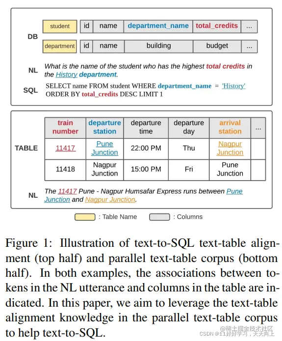 Text-to-SQL任务中一个重要的挑战就是Text-Table的对齐,也即如何将自然语句中关于schema中的table/value提及正确的映射到对应的schema中。如图1所示,模型需要首先辨别出column的提及:total credits, department和值的提及:History,并且可以将它们正确地对齐到所给的schema中。这项任务的挑战主要有以下三点: