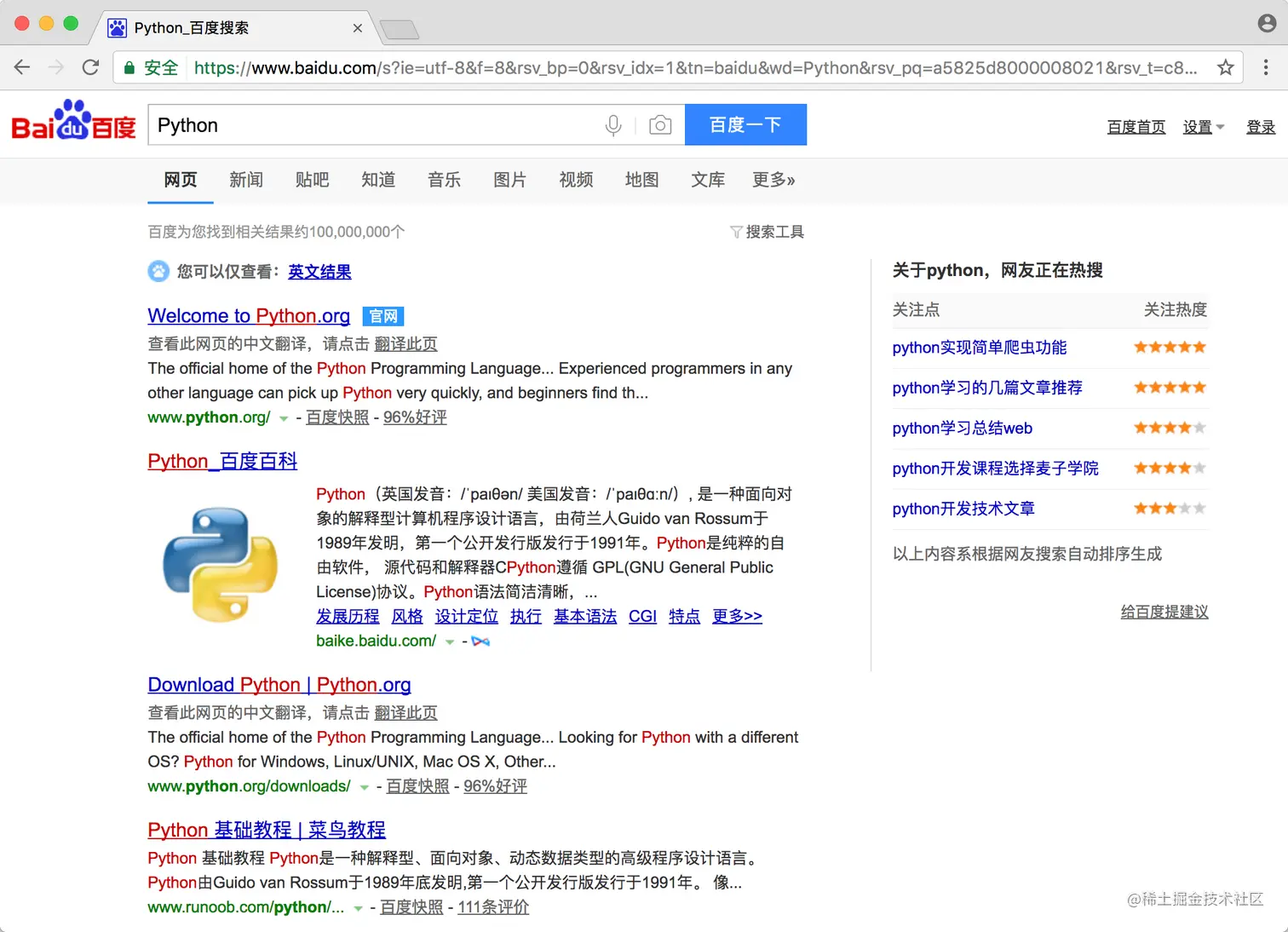 运行代码后发现,会自动弹出一个 Chrome 浏览器。浏览器首先会跳转到百度,然后在搜索框中输入 Python,接着跳转到搜索结果页,如图所示。