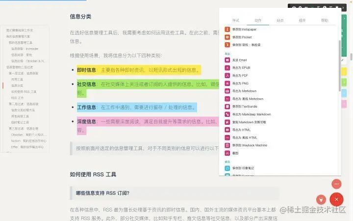 如图:简悦不仅提供了优雅的阅读界面,还内置了内容目录插件。随后,我对网页批注后,点击“动作”,选择“复制 Markdown到剪切板”,随后便可以将全文或者批注所获得的笔记粘贴至 FlowUs 或者其他编辑器之中了。
