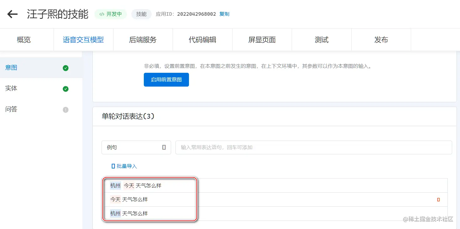 一个语音技能可以包含多个意图。意图代表用户同天猫精灵进行交互对话的目的。比如我的自定义技能,包含了三个意图:体重,天气查询和欢迎意图。意图标识即意图 ID,需要在技能开发人员编写的代码实现里使用到。