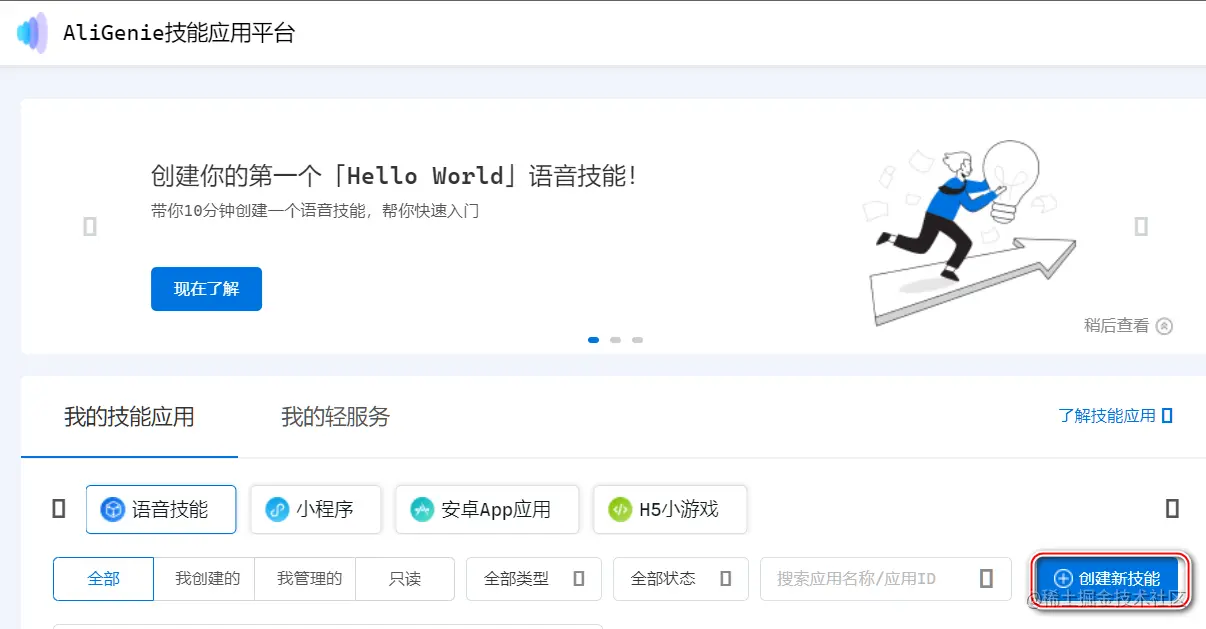 登录 AliGenie 技能应用平台,点击 创建新技能,通过向导创建一个新技能。