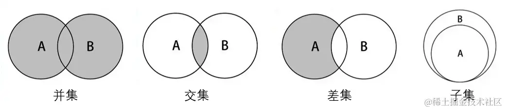 差集:对于给定的两个集合,返回一个包含所有存在于第一个集合且不存在于第二个集合的元素的新集合;