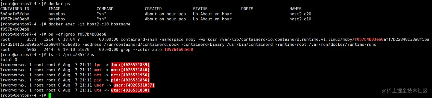 中括号内的为namespace号。如果两个进程指向的namespace号相同,那么说明它们在同一个namespace。