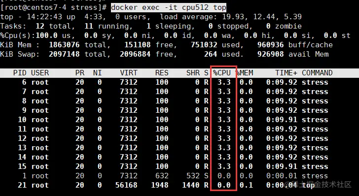 $ docker run -itd --name cpu512 --cpu-shares 512 centos:stress stress -c 10