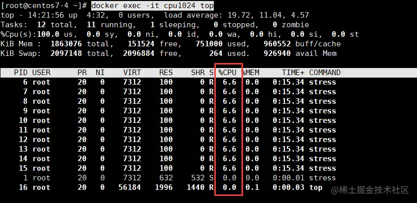 分别进入cpu512和cpu1024之后可以看到,%cpu的比例是1:2,符合我们设置的–cpu-shares参数。