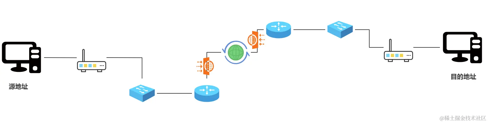 从源地址到目的地址,路由都会处理所经过的设备,包括:路由器、交换机、防火墙等。