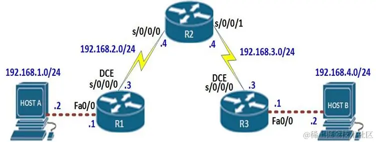 假设只有两个路由器,需要在它们之间配置路由,只需要配置两个路由语句,每个路由器上一个,对于像 RIP 这样的动态路由协议,必须在每个路由器上输入两个网络语句。