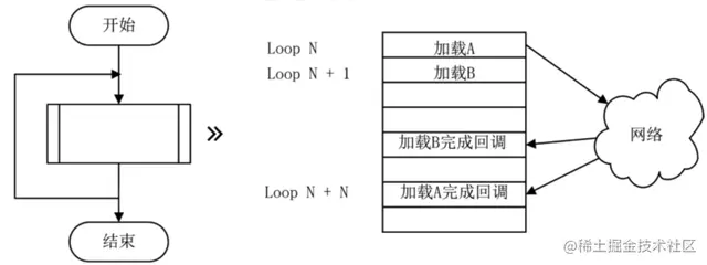 以图1-4为例来看一下异步的流程。在第N帧发出了加载A命令,这一帧会马上结束,不需要等待10秒,直接进入下一帧,不关心A是否加载成功,当它加载成功之后,会在某一帧收到加载成功的回调。因为是异步,同时加载A、B时,得到结果的顺序可能是不一样的,可能A先发出加载命令,但是B的回调却先发生。