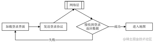网络游戏和单机游戏一样也有一个循环,只是多了一个网络层的处理。实际上因为异步的关系,逻辑会变得更为复杂,图1-2充分展示了这种不同。下面以登录为例来展示一下具体的不同之处,流程如图1-3所示。