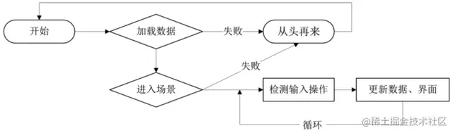 作为玩家,我们可以体验游戏、打开游戏界面、点击操作、得到反馈、继续游戏。下面从编程的角度来看看单机游戏的设计流程。