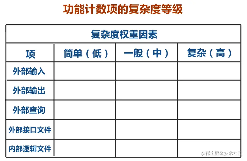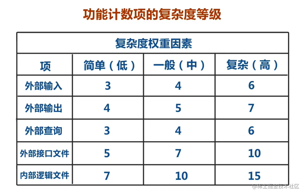 最后我们看一下五个功能计数项的计数权重,他们的权重基本上通过文件,技术类型或者数据元素类型的个数决定的,分三个等级,既高中低。