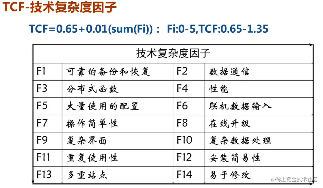 这14个技术复杂度因子(注意:技术复杂度因子的取值范围)相加后乘以0.01再加上0.65得出TCF。