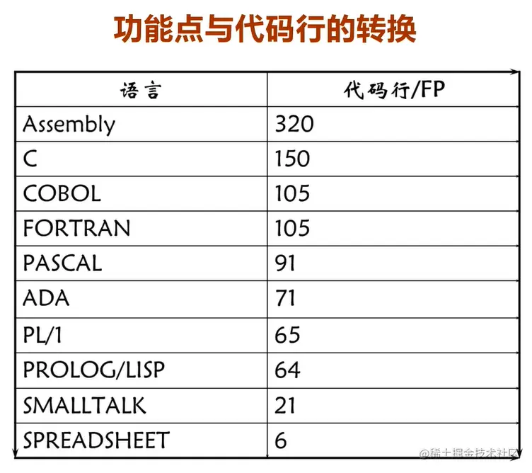 我们知道代码行估算法与实现的语言相关,功能点则不同,那么这个表展示了功能点对应的不同语言代码行数,那么他是通过经验数据统计得出的。