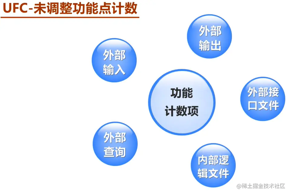 UFC是从五个角度得出的。五个功能计数项:“外部输入”,“外部输出”,“外部查询”,“外部接口文件”,“内部逻辑文件”。
