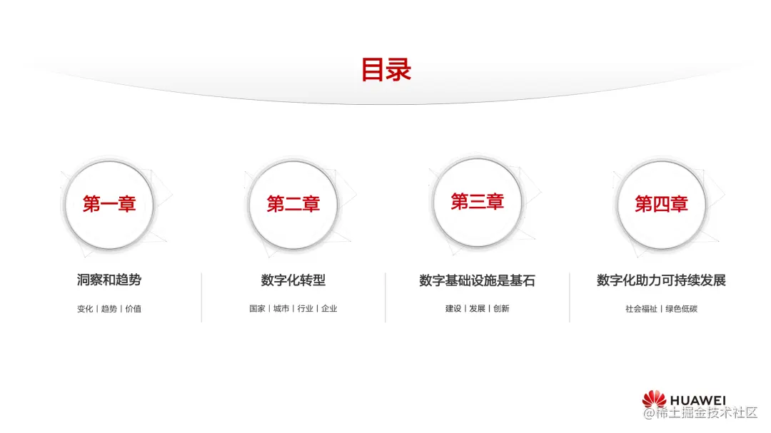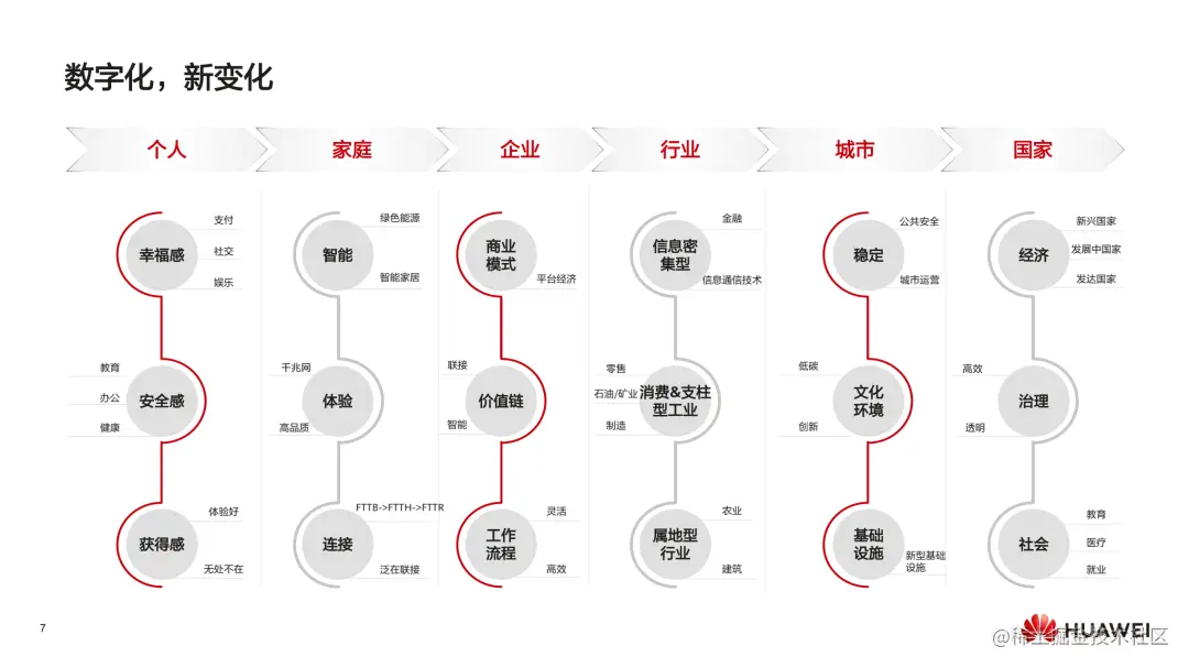 下面这份材料介绍了华为的数字化转型,从战略到执行,结合100多个国家的案例与数据,从6个角度(个人-家庭-企业-城市-行业-国家)、4个层次(国家-城市-行业-企业)、4个阶段(基础信息化-应用数字化-全面系统化-智慧生态化),系统解读数字化转型从战略到执行的全景框架,洞察实践,以及不同数字化转型阶段数字基础设施的部署重点及对数字经济的量化影响。