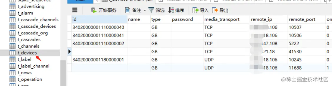 2)将数据接入navicat,找到t_devices,打开表格可以看到恶意注册的通道,通过界面化手动删除,也可以通过数据库语句删除。