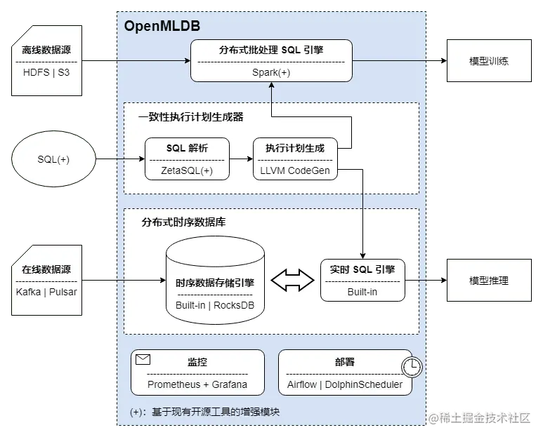 分布式批处理 SQL 引擎 Spark(+):对于面向离线开发的批处理 SQL 引擎,OpenMLDB 基于 Spark 进行了源代码级别的二次优化开发,高效支持 SQL 中对于特征计算的扩展语法。注意,由于批处理引擎实质上并没有任何数据的存储需求,所以这里在逻辑上并不包含一个专用的存储引擎,只需从离线数据源上去读取数据进行计算即可。