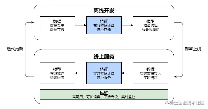 从 Figure-1 可以看到,从横向维度,机器学习全流程被划分成离线开发和线上服务两个相辅相成的流程。从纵向维度,信息价值承载的形式会经历从数据、特征、再到模型的转换过程。