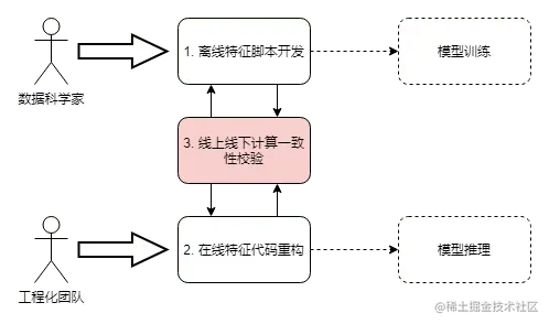 需求沟通的认知差。数据科学家以及工程化团队对于数据的定义和处理方式的认知可能会不一致。美国的一家线上银行 Varo Bank 描述了一个他们在没有合适工具情况下,实时特征上线时碰到的一个不一致场景(具体可以参照他们工程化团队的博客 Feature Store: Challenges and Considerations)。在上线环境中,工程化团队很自然的认为“账户余额”的定义应该就是实时的账户里的余额;但是对于数据科学家来说,通过离线的数据去构建“实时账户余额”其实是一件相当复杂的事情,因此数据科学家使用了一个更加简单的定义,即昨天结束的时候的账户的余额。很明显,两者对于账户余额的认知差,直接造成了线上线下计算逻辑的不一致性。