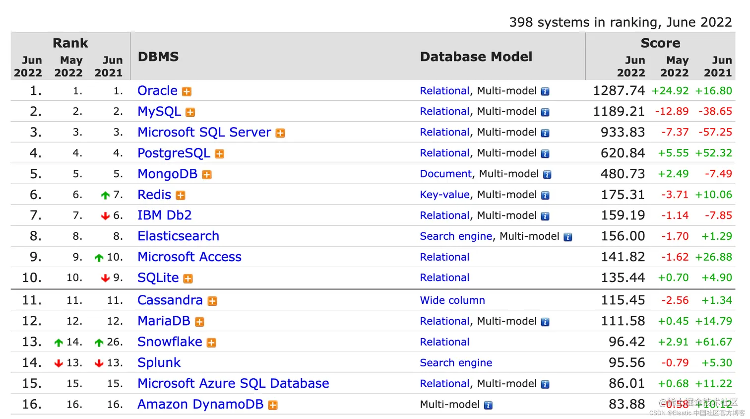 DB-Engines Ranking 根据数据库管理系统的受欢迎程度对它们进行排名。 排名每月更新一次。点击此处查看。