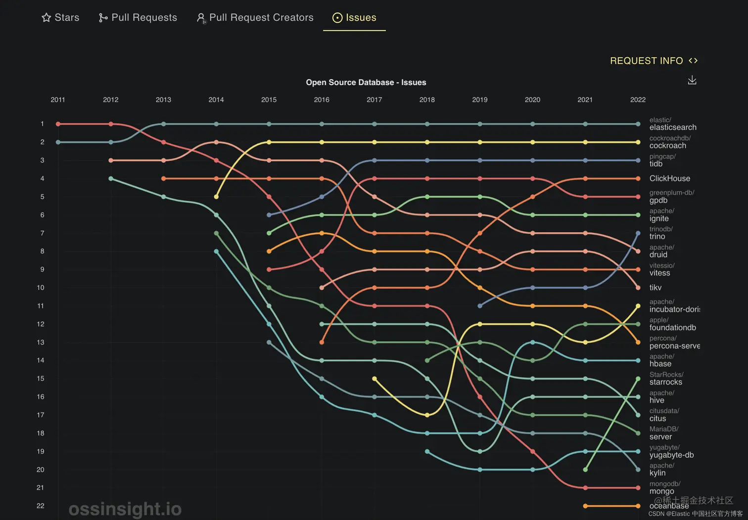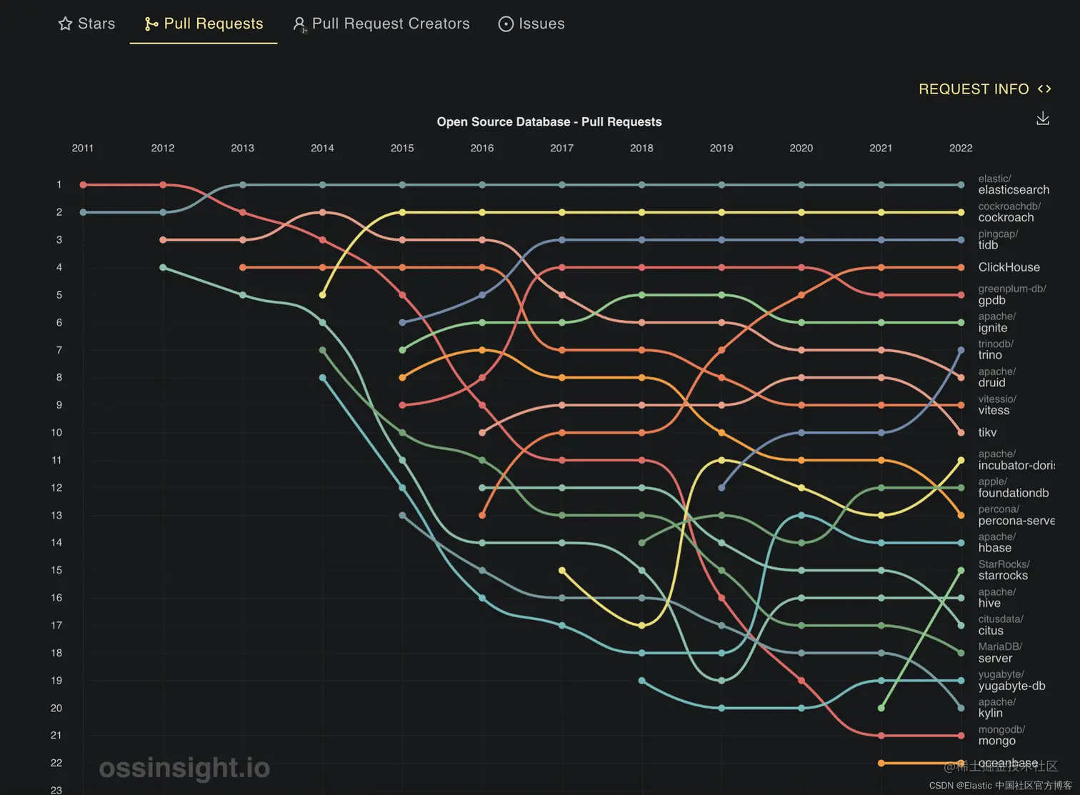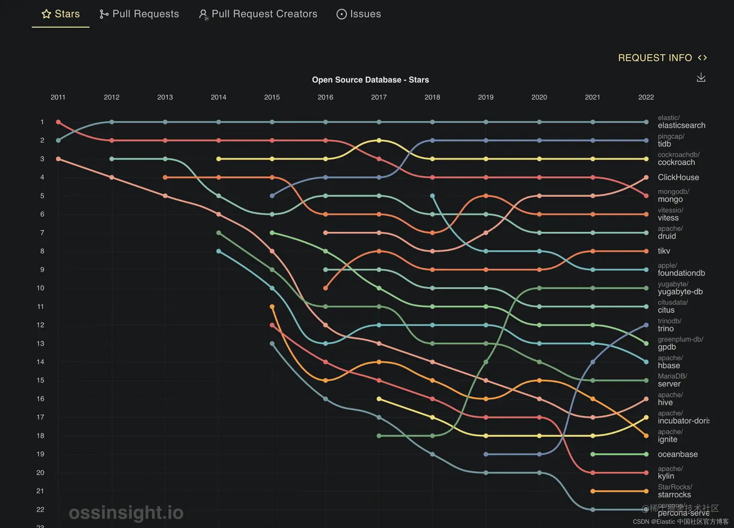 管道图显示了自 2011 年以来每个存储库的四个指标(Star、Pull Request、Pull Request Creators、Issue)的年度排名变化。
