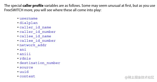 7, Dialplan中可以使用的caller profile 变量,这些变量可以在呼叫中被传递,passed along from one Leg to Another. 特点,ReadOnly