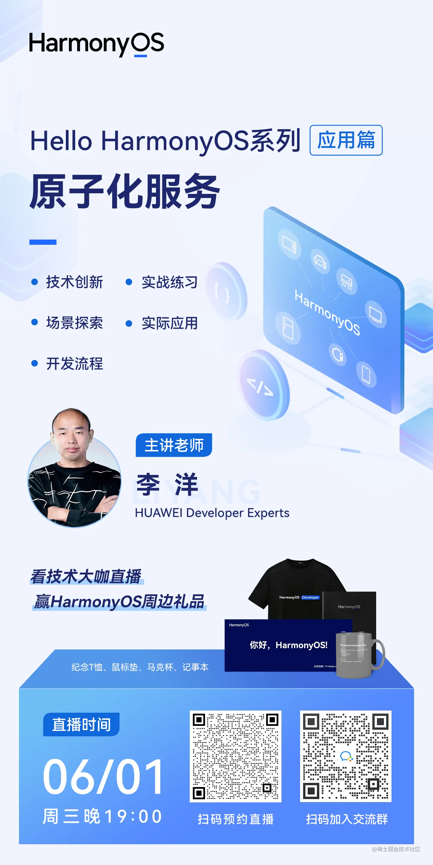 由HDE李洋老师主讲的Hello HarmonyOS进阶系列应用篇第五课《原子化服务》, 已于6月1日晚上 19 点在HarmonyOS社群内成功举行。 本节课李洋老师带领大家了解HarmonyOS原子化服务的技术特性与创新性,对智能家居、智慧出行、运动健康、智慧办公、影音娱乐、教育关怀等场景进行探索,对HarmonyOS原子化服务开发的关键因素与整体流程进行解说,还有实战模板案例教学演示,组件、DEMO综合实践经验分享,开发者也学习到原子化服务与实际应用创新如何有机结合!