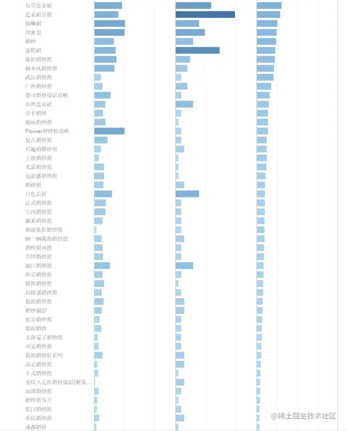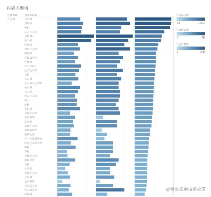 从uv平均数top10可知,含材质、风格、设计的关键词容易有高日活量。其中,店铺的衬衫裙、神仙裙子、格子裙流量可观,婚纱类的日活较低。