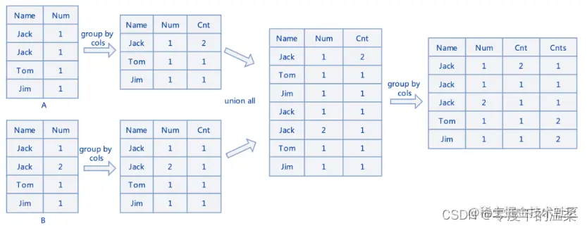 第二步 UNION ALL 两表数据,第三步再按所有列(这里是 name, num 和 cnt 字段) GROUP BY 一次产生最终表,在最终表中 cnts 值为2的行表示这行数据在两表中都有且重复值一致,对于值非2的数据就是差异行了。