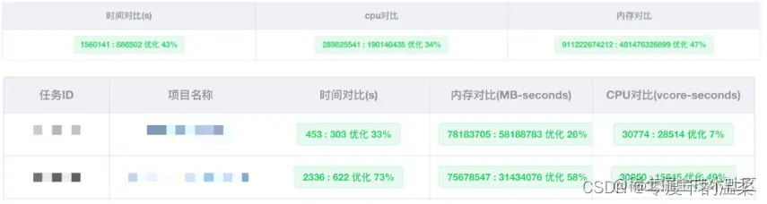 资源利用率的提升是做引擎升级的出发点,除了结果对比来保证数据准确性,我们还做了资源消耗对比来保证迁移的收益。对比系统收集了每个作业的执行时间以及消耗的资源,从执行时间、CPU 和内存的资源消耗进行两个引擎执行性能的对比,在执行最终迁移前依据收集的数据为用户提供了迁移的预期收益,提高了用户迁移任务的积极性。从迁移中收集的数据来看 hive 切到 spark 可以减少40%以上的执行时间,同时整体资源消耗降低30%以上。
