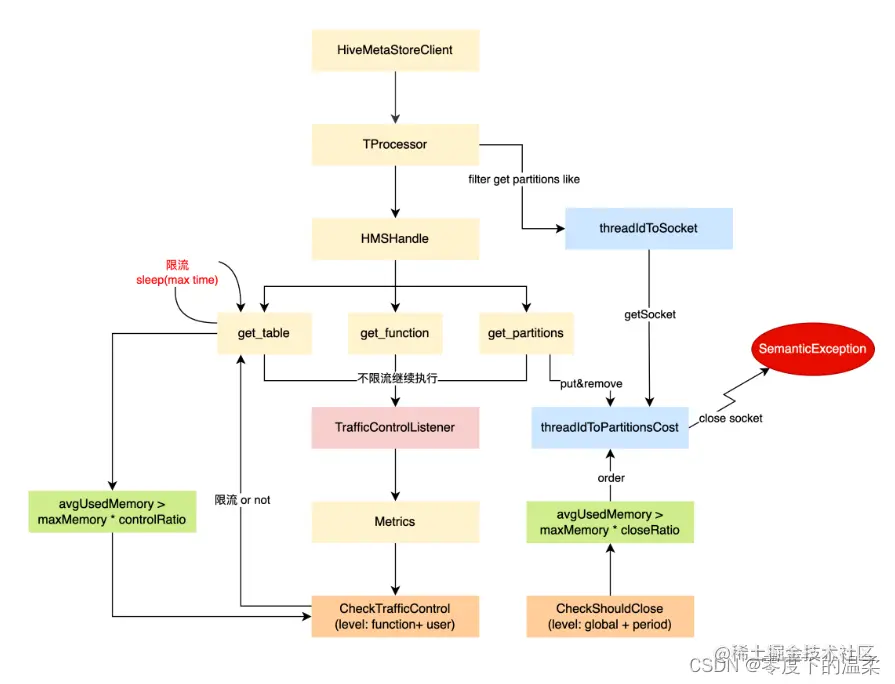 HMS 也有可能因为 getPartitions 方法返回的分区数量太大导致内存被打满,一方面我们限制了 getPartitions 从 mysql 返回的分区数量,超过一定数量就直接拒绝该请求,另一方面我们在 TProcessor 中以 threadId 和 socket 为 key 和 value 保存当前的连接,在检查 partition 数量时我们也按照 threadId 和 num partitions 为 key 和 value 保存 partition 的 cost,当 HMS 平均使用内存达到阈值超过一定时间后,会选择 num partitions 最大的 threadId,再根据 threadId 获取对应的连接,主动 close 该连接,来缓解内存压力。