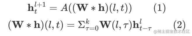 其中(1)式中 h 是网络结构中第 i 层在时刻 t 的内部状态。*是卷积操作,W 是第 l 层指定的过滤权重,A(.)为激活函数,例如 sigmoid,用以处理任何特定架构的非线性表征。