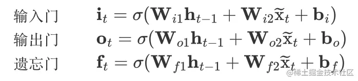 其中ht−1是 LSTM 的隐藏状态,σ(.)是 sigmoid 激活函数。LSTM 的隐藏和单元状态如下: