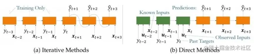 其中τ∈[1,...,τmax]是预测的离散范围,xt为整个时间线已知的特征输入(例如日期信息,例如星期几或月份),且是只能在历史上观察到的输入。与传统的计量经济学方法一致,用于多步预测的深度学习架构可以分为迭代法和直接法,如下图所示(后续详细描述):