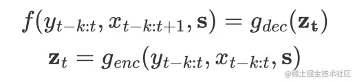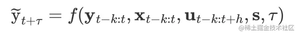 其中公式左侧为模型预测值,公式右侧分别是在回溯窗口上对目标和外生输入的观察,si是与实体相关的静态元数据(例如传感器位置),f(.)是模型学习的预测函数。虽然我们在本黑板报中专注于单变量预测(即一维目标),但我们注意到相同的组件可以不失一般性地扩展到多变量模型。简单起见,除非明确要求,否则在后续部分中省略了实体索引 i。