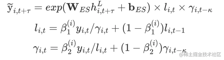 其中hi,t+τL是第τ步预测的网络的最后一层,li,t步长分量,γi,t是周期为κ的季节性分量,β1(i)和β2(i)是实体特定的静态系数。从上述等式中,我们可以看到指数平滑组部分(li,t,γi,t)处理数据集中更广泛的(例如指数)趋势,从而减少了对额外输入缩放的需求。