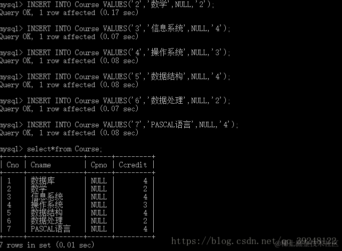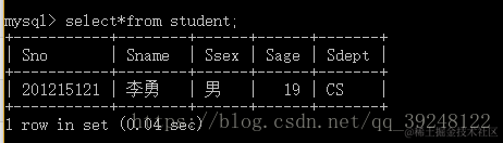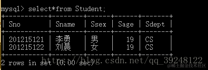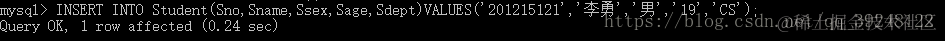 INSERT INTO Student(Sno,Sname,Ssex,Sage,Sdept)VALUES('201215121','李勇','男','19','CS');