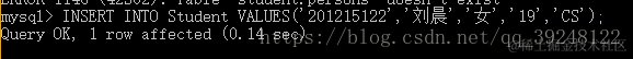 INSERT INTO Student VALUES('201215122','刘晨','女','19','CS');