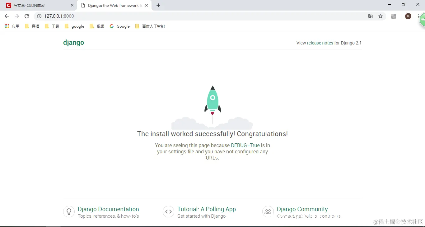 输入url http://127.0.0.1:8000/ (切记 :8000 这个是必须输入的,这个是njango的端括号)