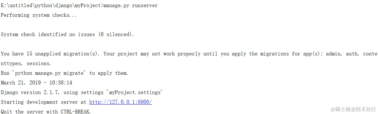 启动django的服务器,需要进入你的项目文件目录下,例如我的是在myProject这个目录下,这里可以可以dir看该目录下是否有manage.py这个文件,有的话执行