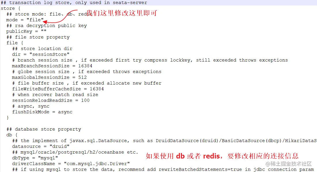 这里我们为了省事,配置为 file 模式,这样事务会话信息读写在内存中完成,持久化则写到本地 file,如下图: