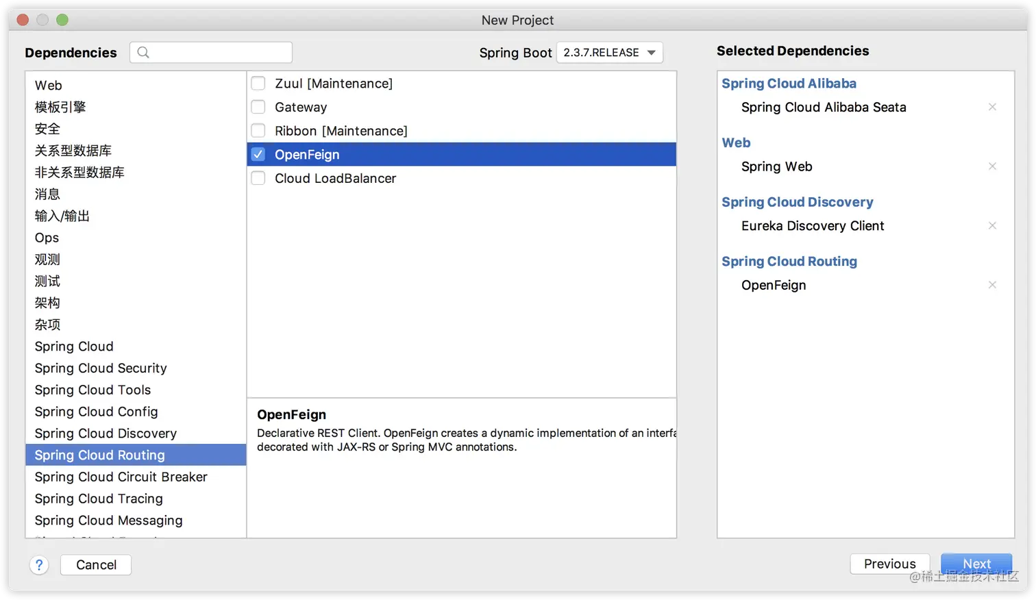 再来看 order。order 这里就是下订单,下订单之前先扣款,扣款成功的话就添加一条订单记录。所以我们要在 order 服务中通过 OpenFeign 去调用 account 服务,先在启动类上开启 OpenFeign 的使用: