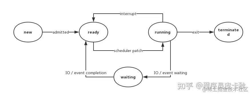 首先最开始是创建阶段 NEW, 下一个阶段是就绪阶段 Ready, 紧接着就是调度转为执行阶段 Running, 执行的这个过程中,可能会被打断又变为Ready阶段,还有可能一些IO阻塞事件有又变为等待阶段 Waiting, 这个阶段又转换为 Ready阶段,当退出时,会转化为结束阶段 Terminated。说的有点抽象,大家可以对照下图理解一下。