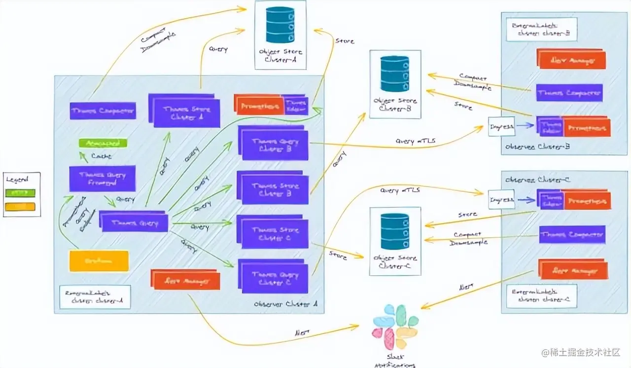 - 配置了TLS的Thanos查询器对每个被观察集群进行查询